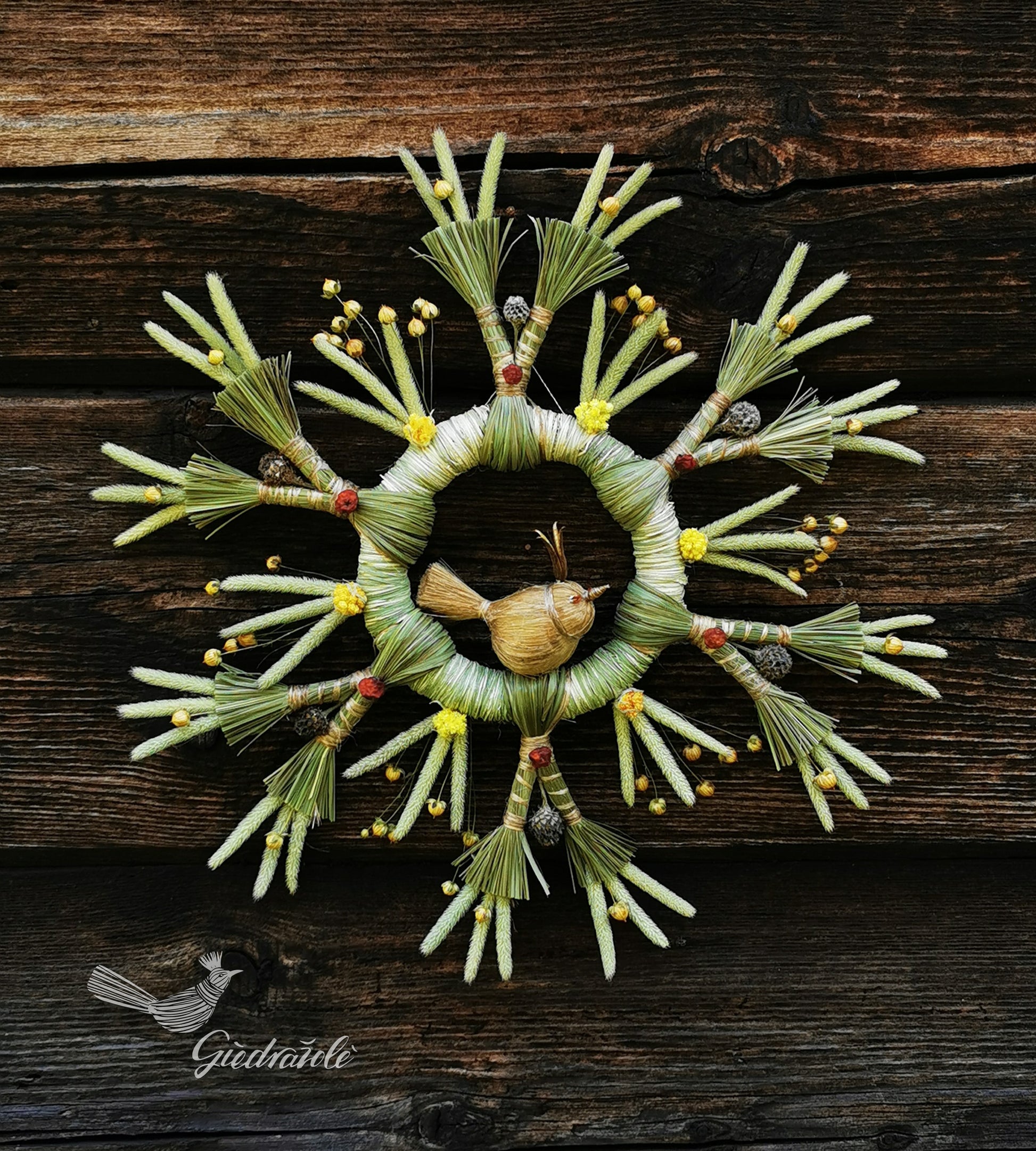 Dried wild plants: Carex cespitosa, Phleum, Centaurea, linen fibre.